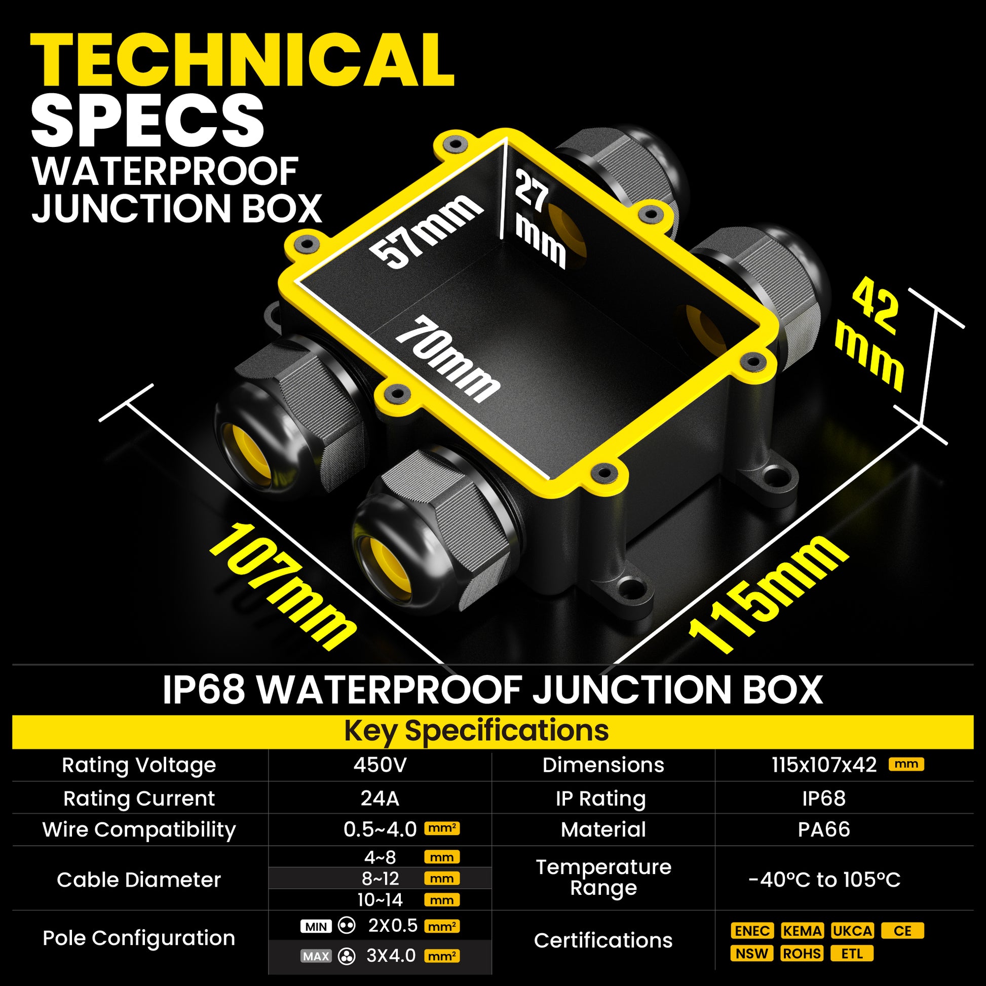 💦【Spezifikationen】Nennstrom ≤ 24A, Nennspannung ≤ 450V, Kabeldurchmesser: Ø4mm-14mm, Kabelquerschnittsfläche: 3X0,5mm² ~ 3X4mm², Arbeitstemperatur: -40℃±105℃. Innenmaße: 70x57x27mm, Außenmaße: 115x107x42mm.