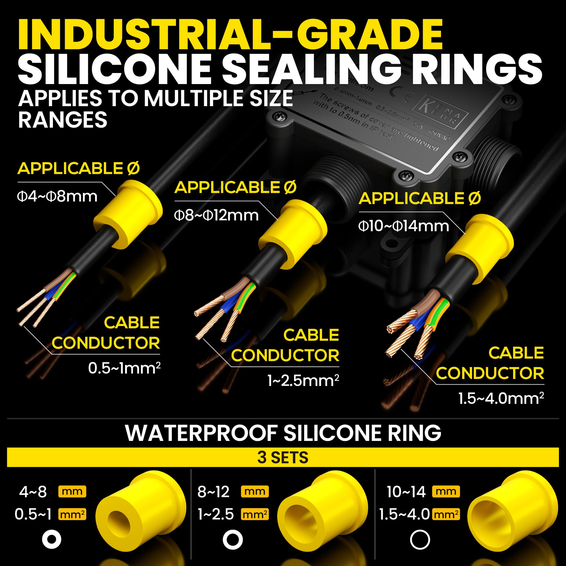 💦【Merkmale】Die Abzweigdose verfügt über ein präzises Design und ist mit 3 Sätzen Dichtungsringen unterschiedlicher Größe ausgestattet. Sie ist für Kabeldurchmesser von 4–8 mm, 8–12 mm und 10–14 mm geeignet. Sie kann eine bessere Wasserdichtigkeit für verschiedene Drähte erreichen.