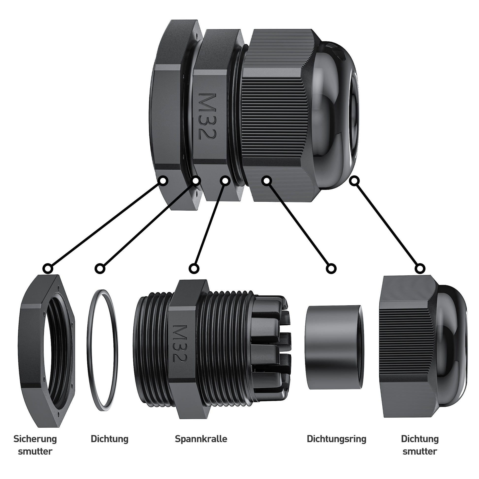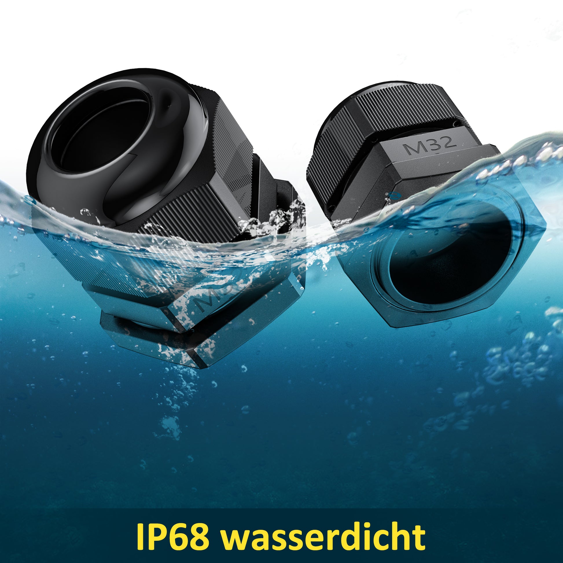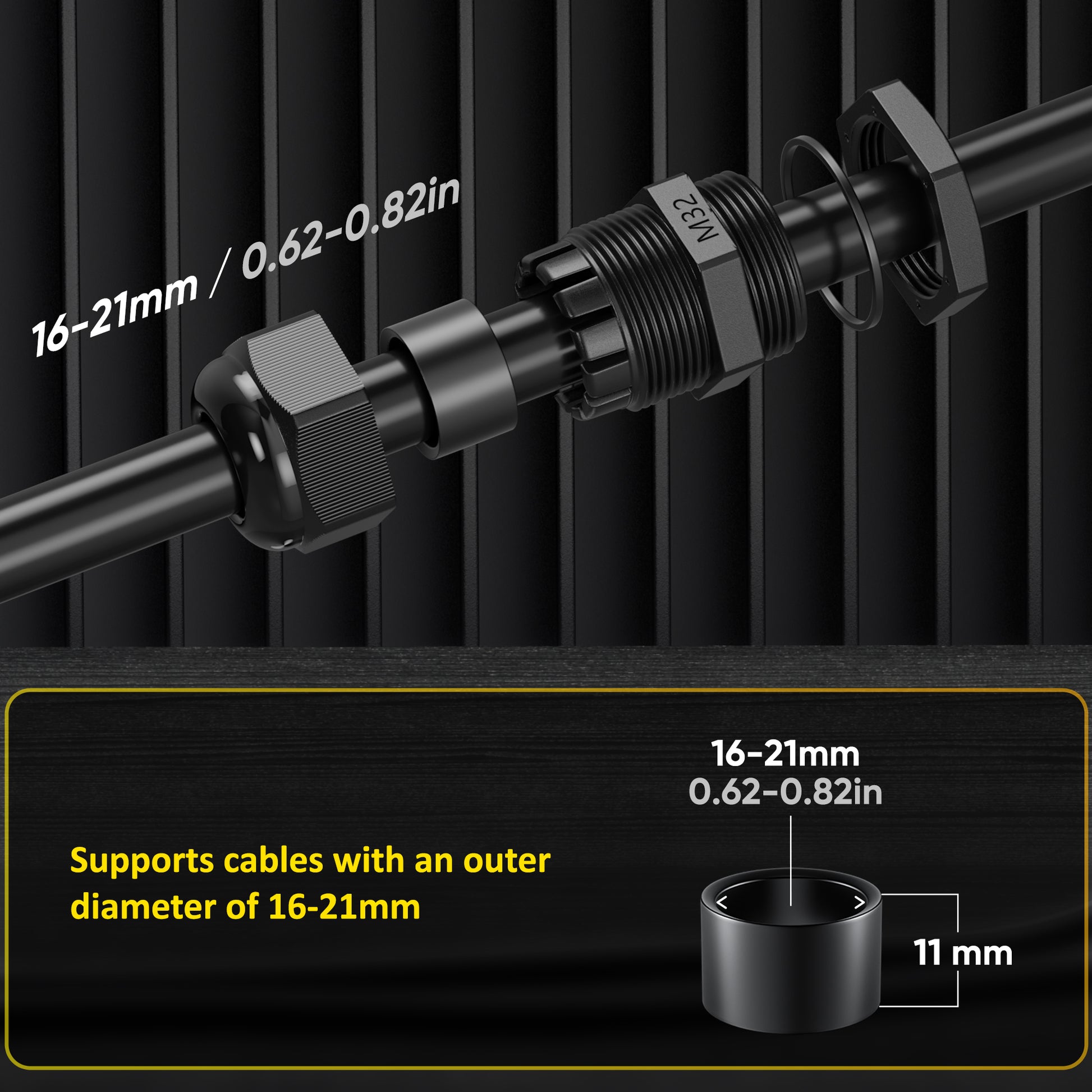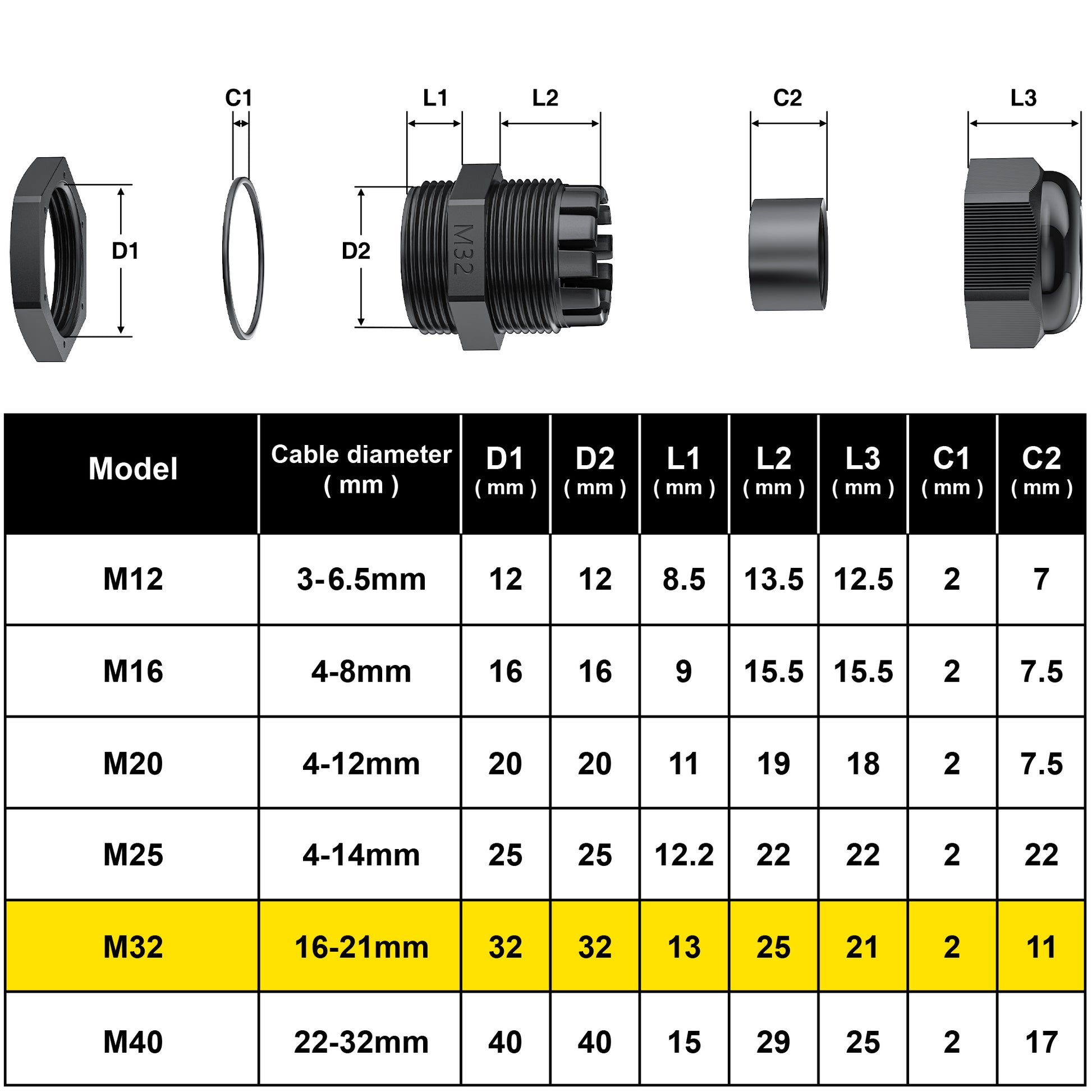 - 💦【Spezifikation】Kabelverschraubungen Modell: M32; Kabelbereich: 16-21 mm; Gewinde O.D .:32 mm. Gewindelänge:12mm. Arbeitstemperatur: -40℉bis 212℉(-40 ℃ bis 100 ℃), maximal 248℉ (120℃).