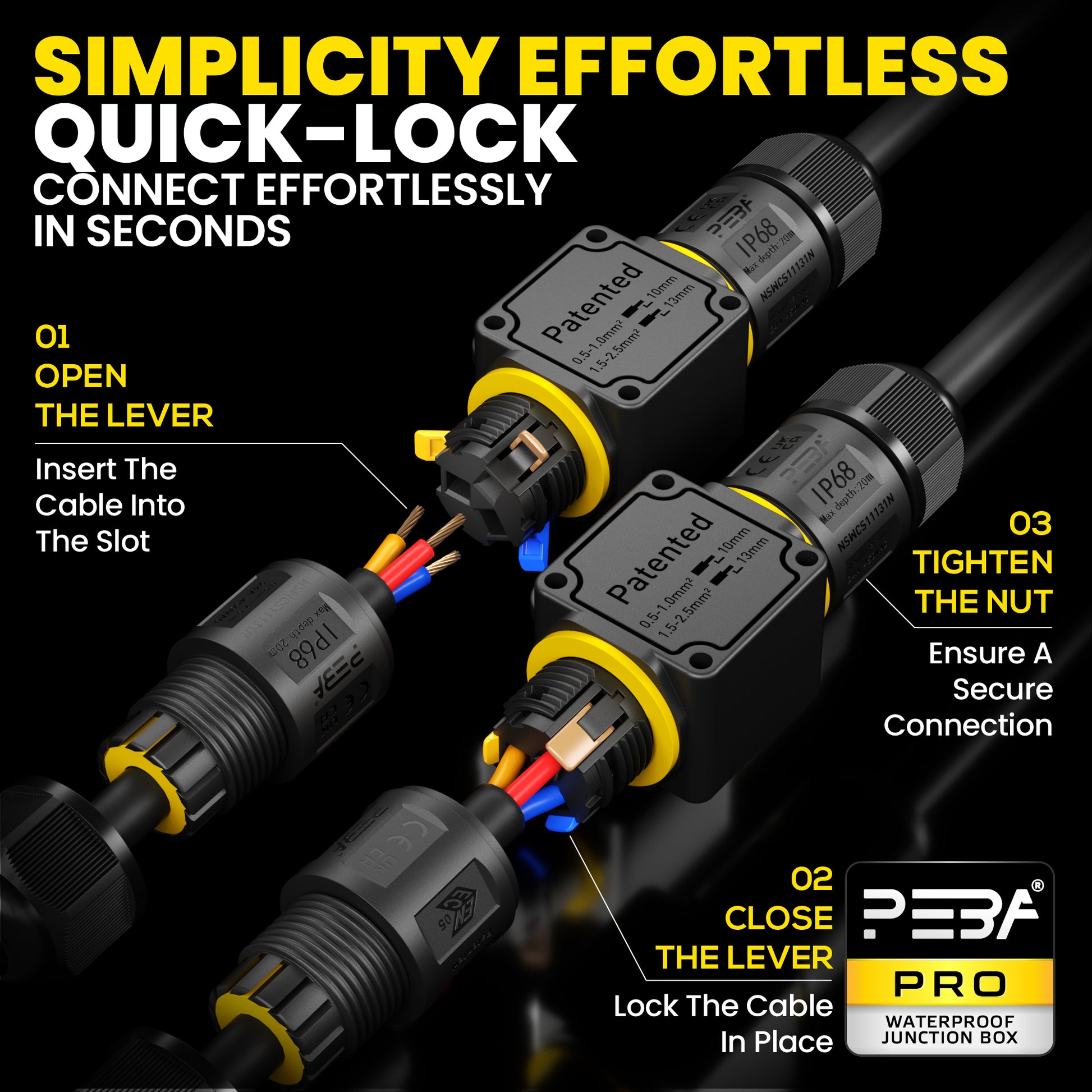 PEBA Kabelverbinder Wasserdicht 3 polig, 2-Wege IP68 Wasserdichte Kabelverbinder 4-12 mm Kabeldurchmesser, Verteilerdose außen, 3-Leiter, Verbindungsklemme mit Hebel für Outdoor, Abzweigdose Schwarz