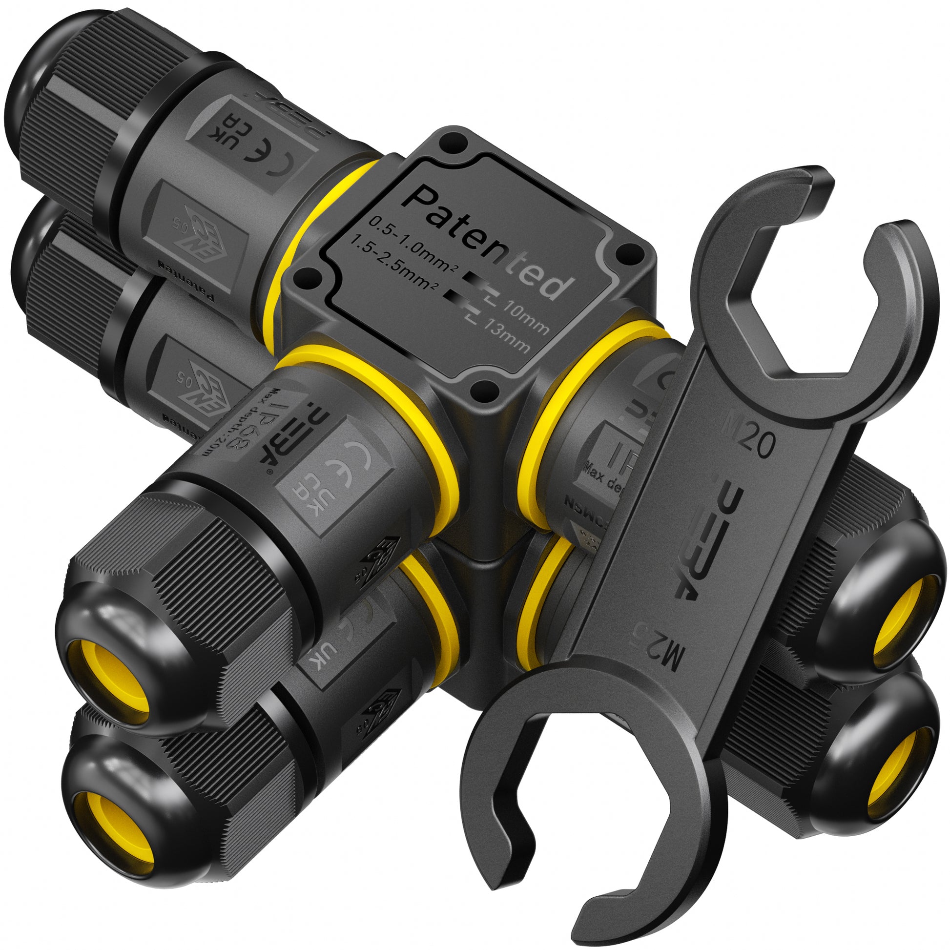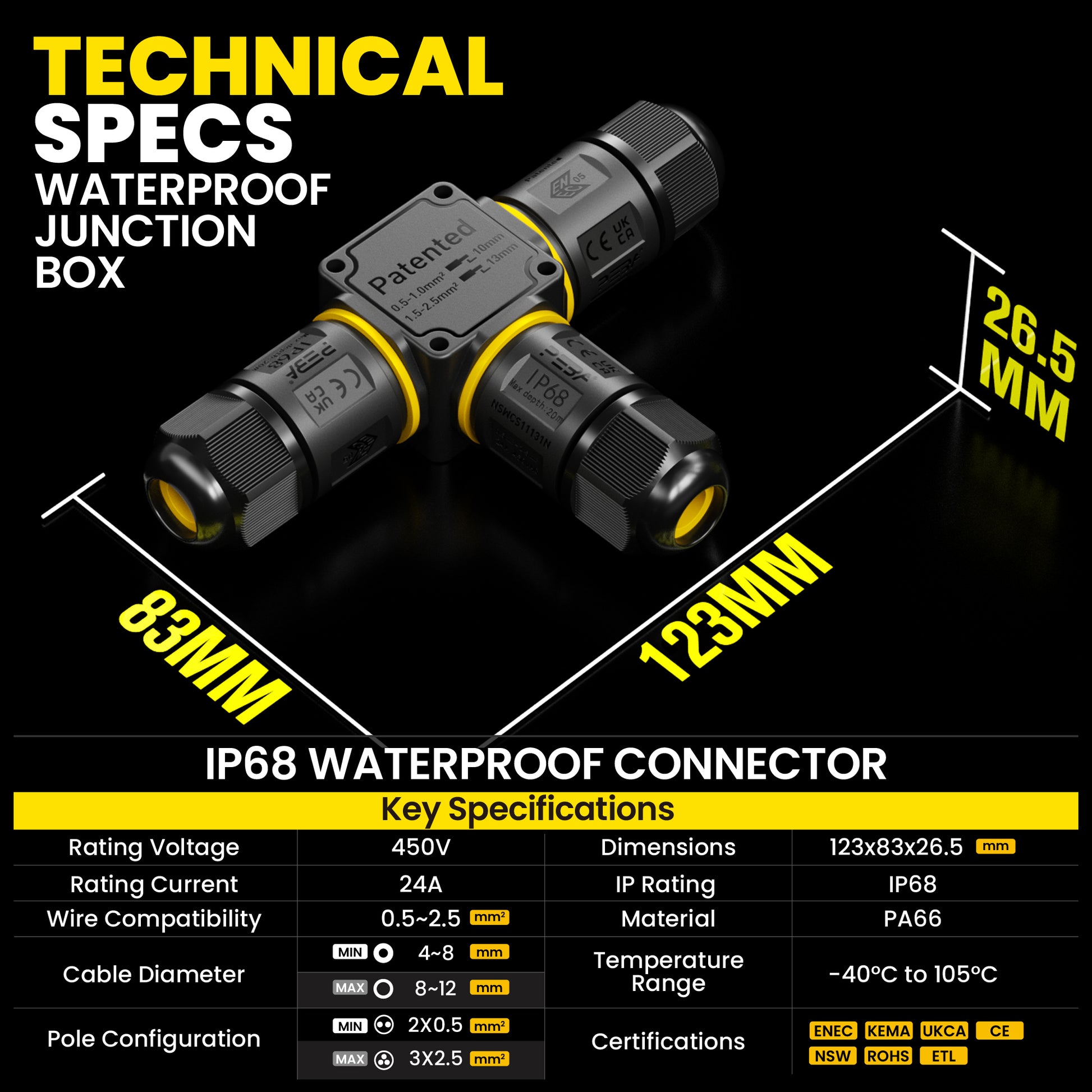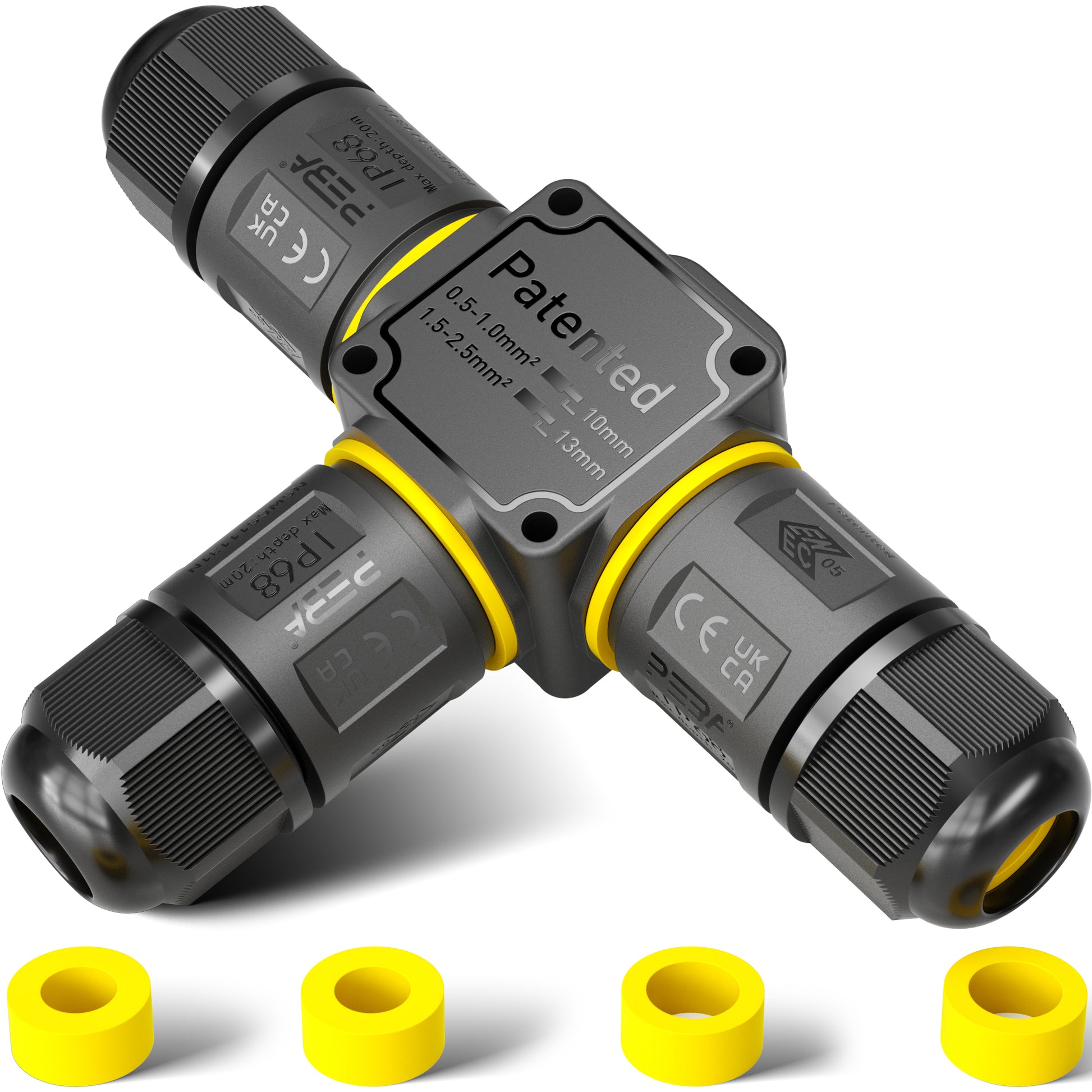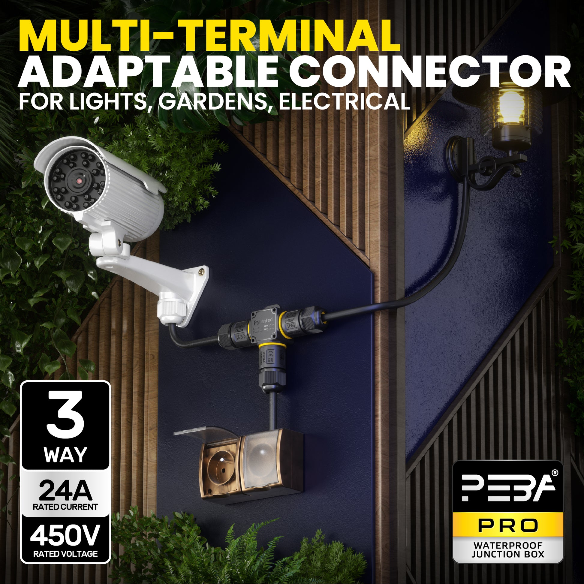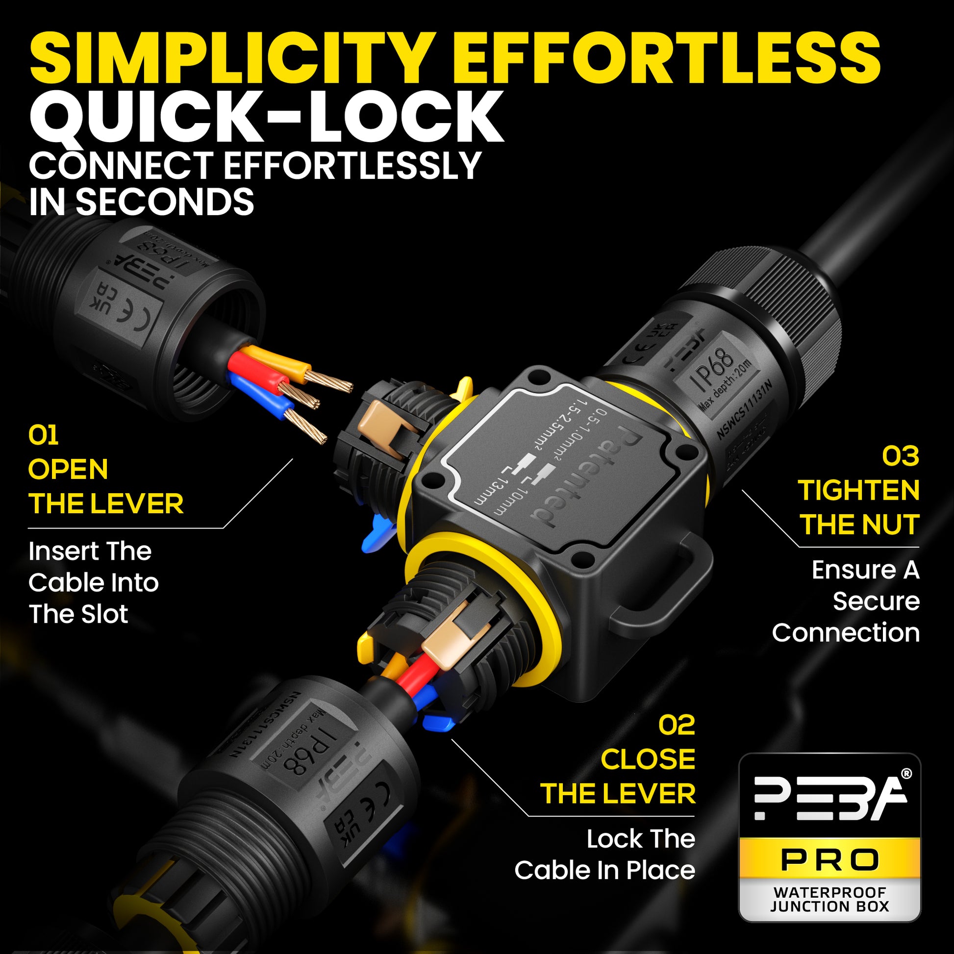 PEBA® Kabelverbinder Wasserdicht 3 polig, 3-Wege IP68 Wasserdichte Kabelverbinder Ø4-12mm Kabeldurchmesser, Verteilerdose außen, 3-Leiter, Verbindungsklemme mit Hebel für Outdoor, Abzweigdose Schwarz