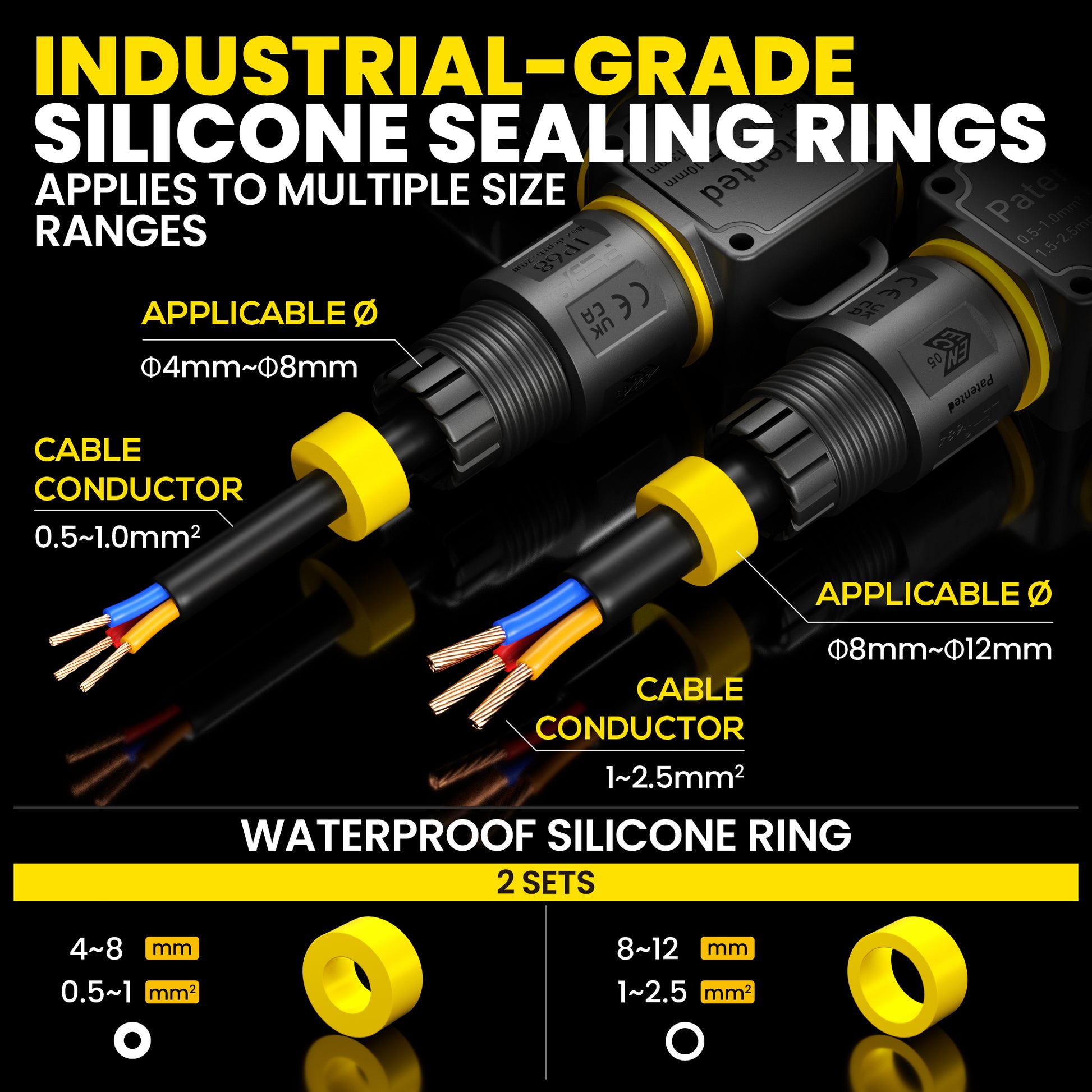 💦【Merkmale】3-Leiter Anschluss, Schneller Anschluss, Einfache und werkzeuglose Handhabung dank Hebel Bauweise.Kommen Sie mit 2 Sets versiegelter Silikagel-Pads unterschiedlicher Größe, Sie ist für Kabeldurchmesser von 4-8mm und 8-12mm geeignet. Sie kann eine bessere Wasserdichtigkeit für verschiedene Drähte erreichen.