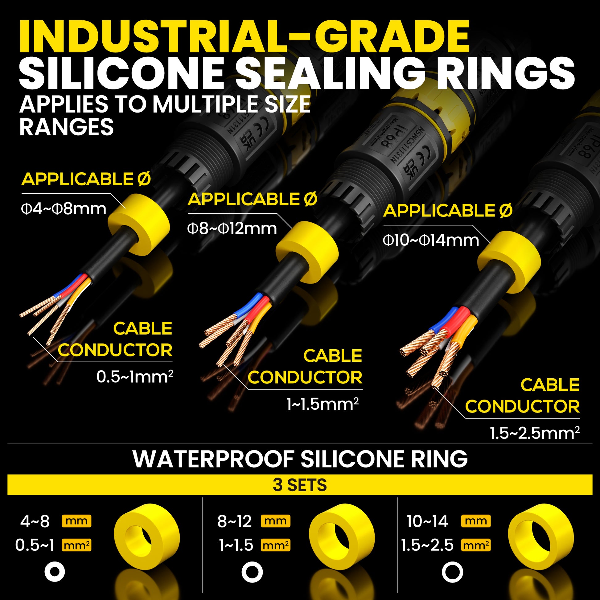 - 💦【IP68 Waterproof】Abzweigdosen Professionelles wasserdichtes Design,bis zu IP68(20 Meter Wassersäule 150 Stunden Test), Dass es unter der Sonne oder in regnerischen oder in schneereichen Tagen verwendet werden könnte.Kommen Sie mit 2 Sets versiegelter Silikagel-Pads unterschiedlicher Größe, die für beide Enden der Abzweigkasten verwendet werden, die für Kabeldurchmesser von 4-14 mm geeignet.Verwenden Sie bitte die richtigen Dichtungen zu den Kabeldurchmessern.