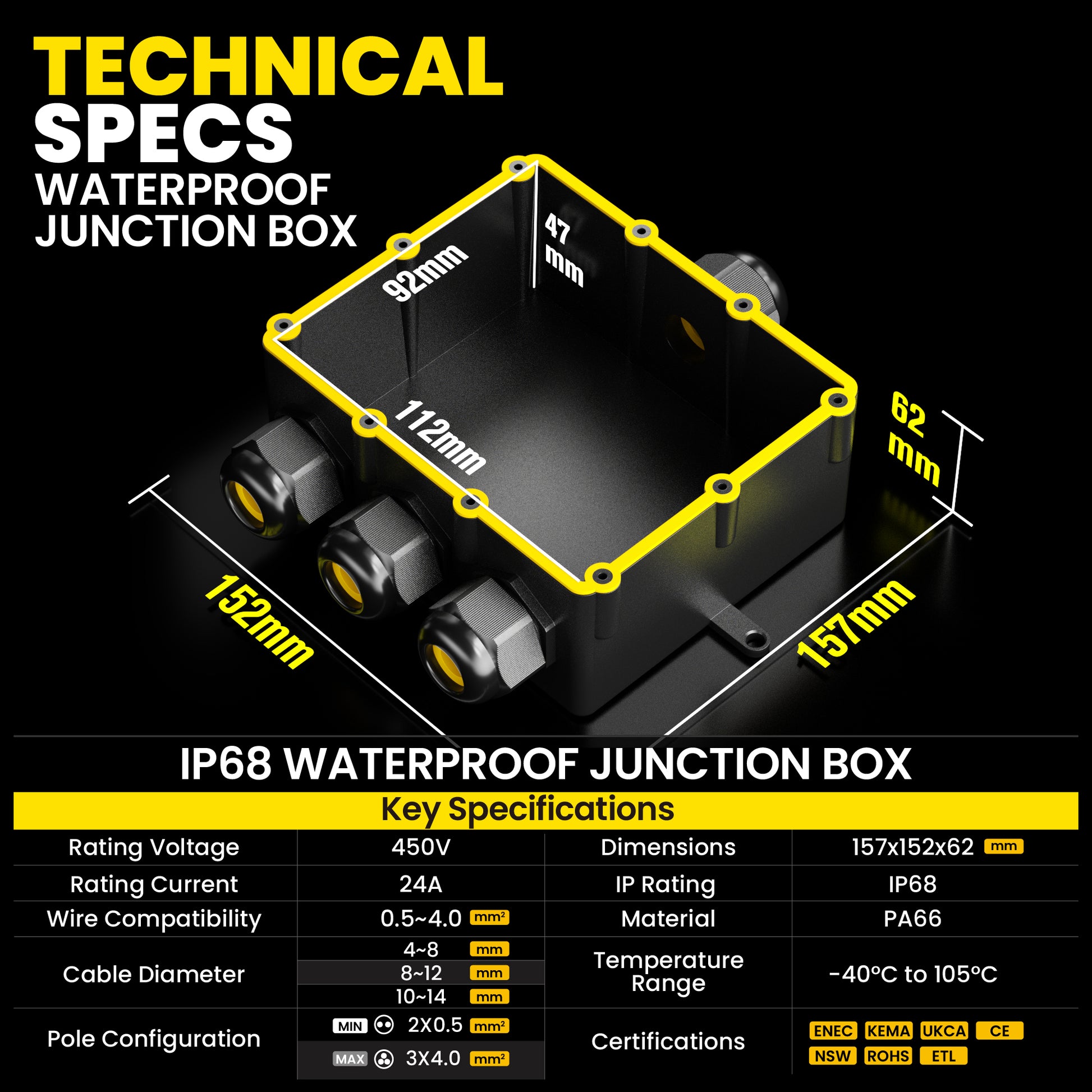💦【Spezifikationen】Nennstrom ≤ 24A, Nennspannung ≤ 450V, Kabeldurchmesser: Ø4mm-14mm, Kabelquerschnittsfläche: 3X0,5mm² ~ 3X4mm², Arbeitstemperatur: -40℃±105℃. Innenmaße: 112x92x47mm, Außenmaße: 157x152x62mm.