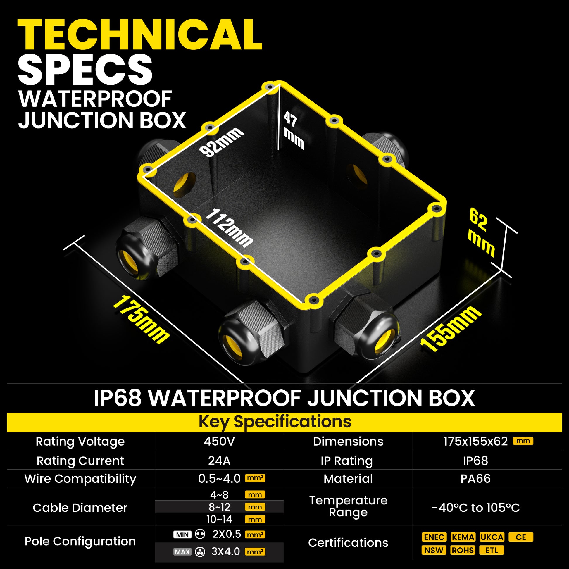 💦【Spezifikationen】Nennstrom ≤ 24A, Nennspannung ≤ 450V, Kabeldurchmesser: Ø4mm-14mm, Kabelquerschnittsfläche: 3X0,5mm² ~ 3X4mm², Arbeitstemperatur: -40℃±105℃. Innenmaße: 112x92x47mm, Außenmaße: 189x168x62mm.