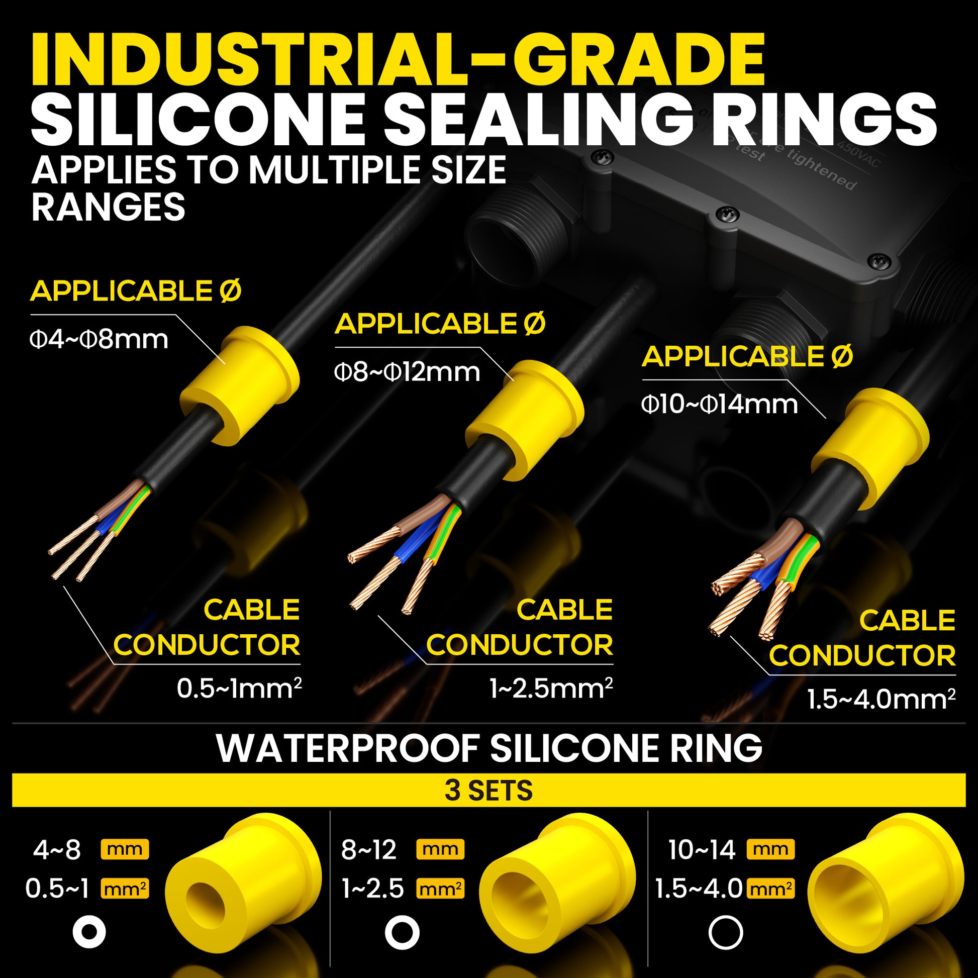 💦【Merkmale】Die Abzweigdose verfügt über ein präzises Design und ist mit 3 Sätzen Dichtungsringen unterschiedlicher Größe ausgestattet. Sie ist für Kabeldurchmesser von 4–8 mm, 8–12 mm und 10–14 mm geeignet. Sie kann eine bessere Wasserdichtigkeit für verschiedene Drähte erreichen.