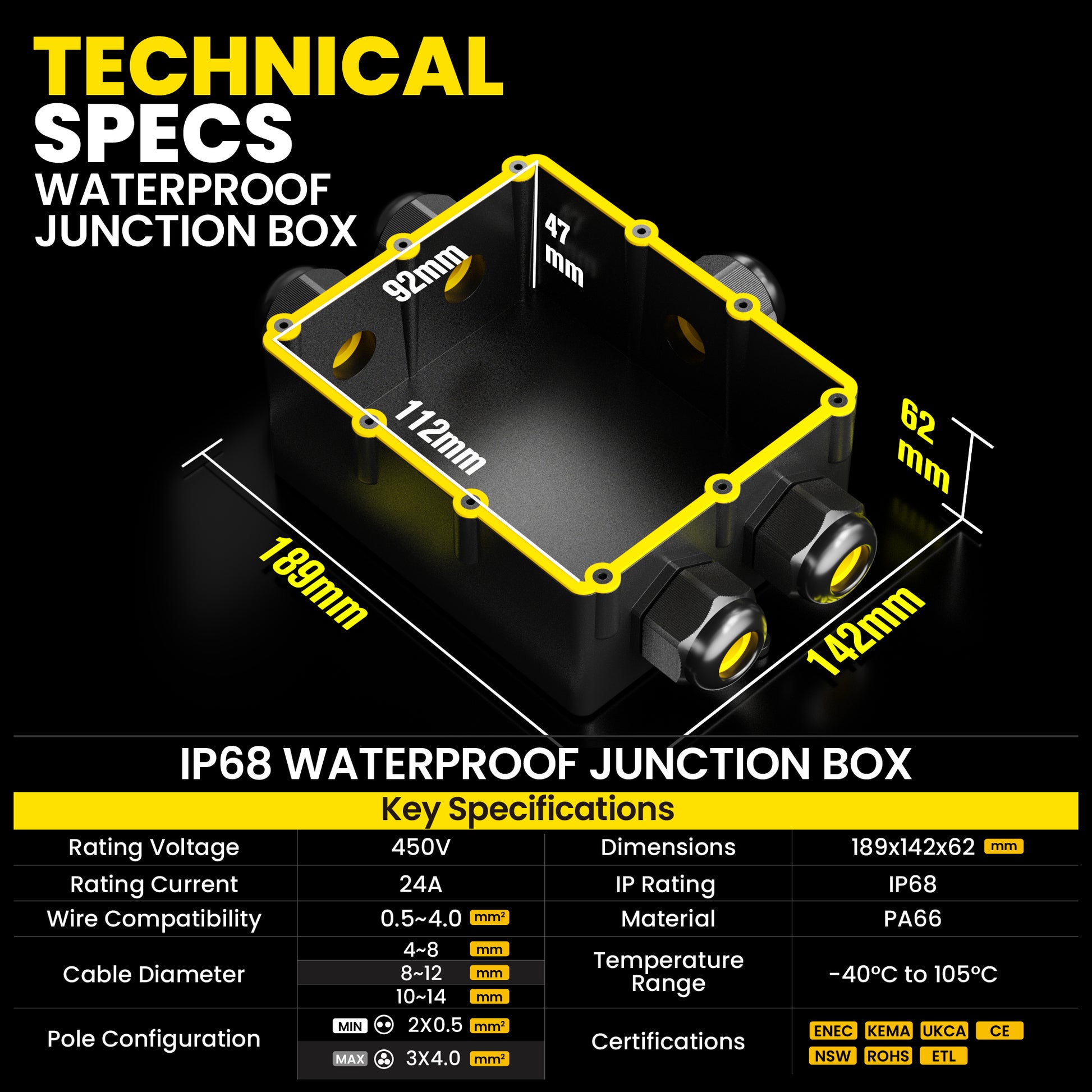 💦【Spezifikationen】Nennstrom ≤ 24A, Nennspannung ≤ 450V, Kabeldurchmesser: Ø4mm-14mm, Kabelquerschnittsfläche: 3X0,5mm² ~ 3X4mm², Arbeitstemperatur: -40℃±105℃. Innenmaße: 112x92x47mm, Außenmaße: 189x142x62mm.