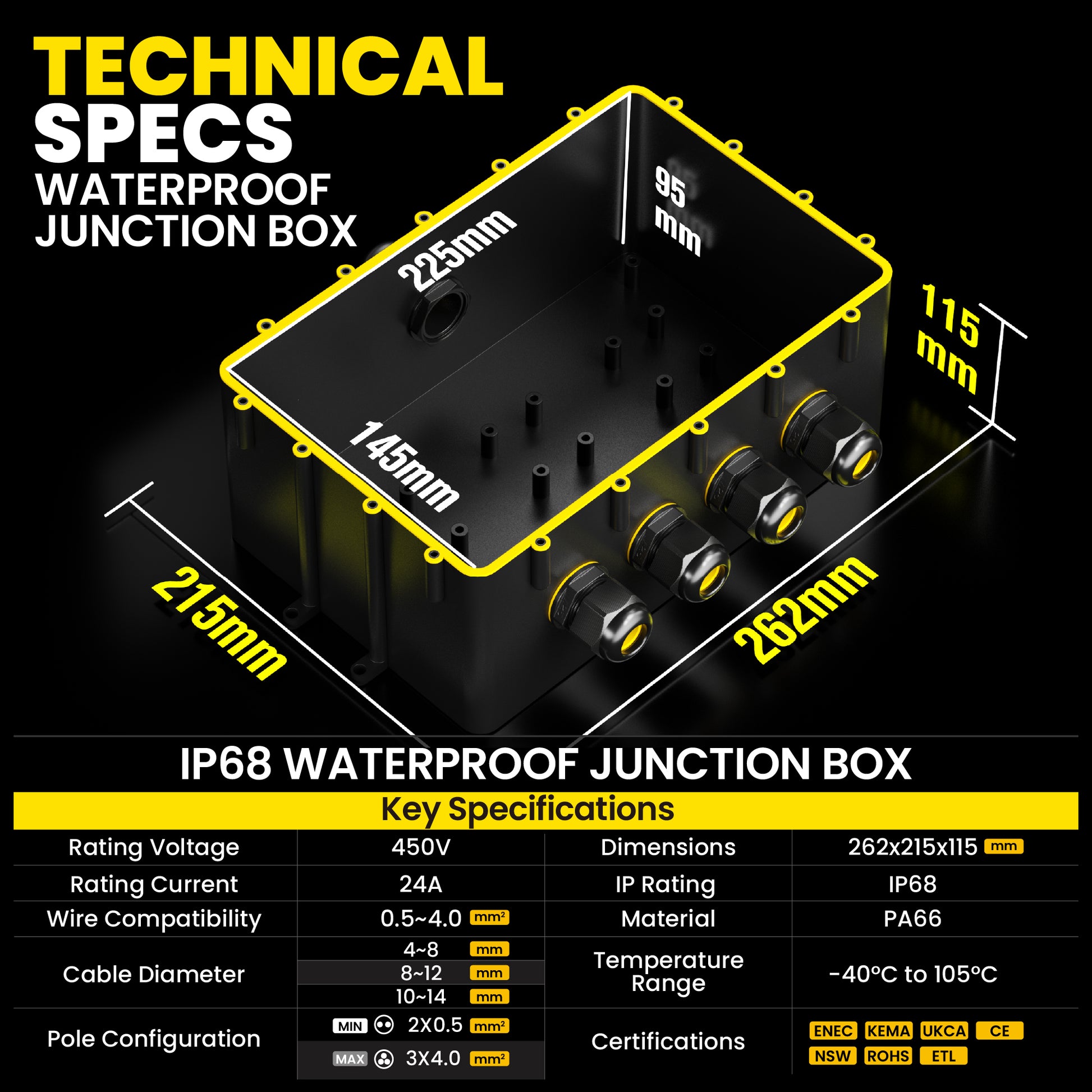 💦【Spezifikationen】Nennstrom ≤ 24A, Nennspannung ≤ 450V, Kabeldurchmesser: Ø4mm-14mm, Kabelquerschnittsfläche: 3X0,5mm² ~ 3X4mm², Arbeitstemperatur: -40℃±105℃. Innenmaße: 225x145x95mm, Außenmaße: 262x215x115mm.